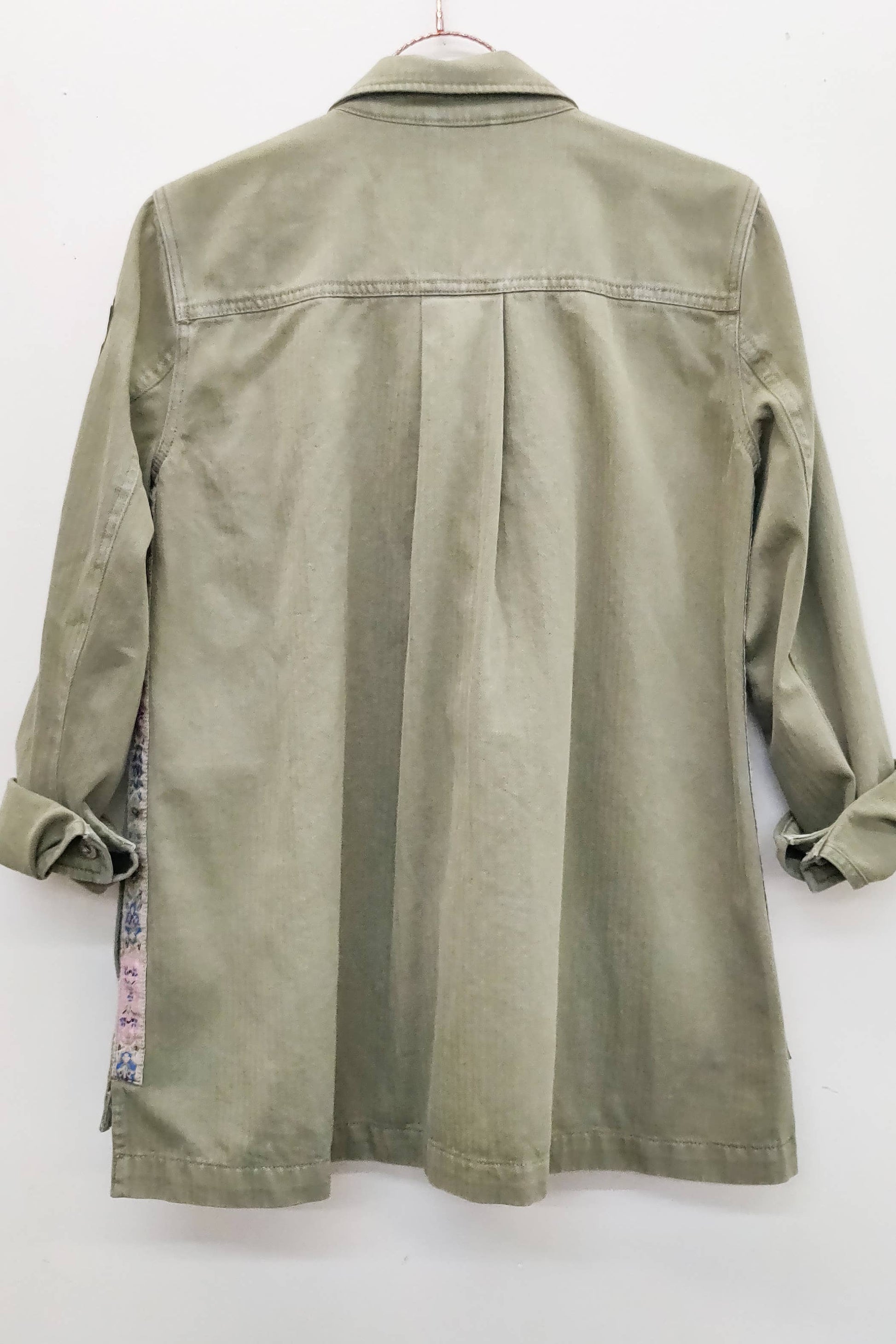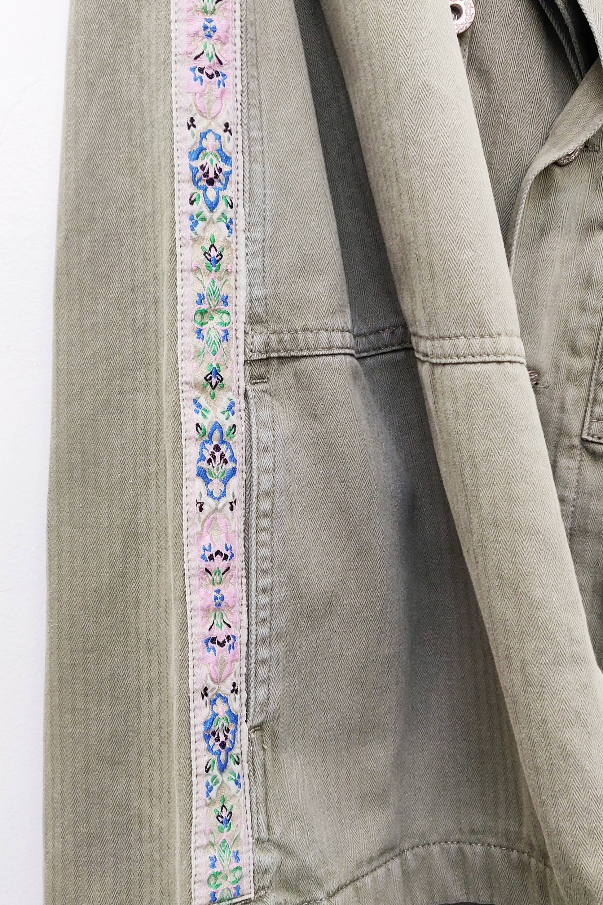 * Twill weave cotton army button-up jacket with royal/bee patches on left sleeve, pins on