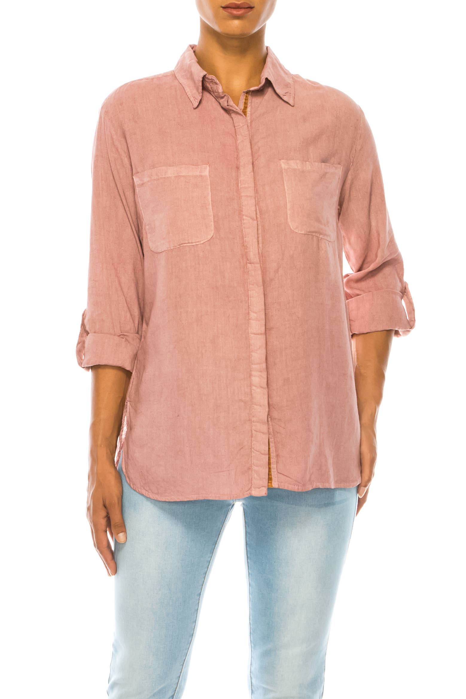 Pink Suede Featured on a pink background, this linen shirt is made from a cotton linen blend heavier fabric, with luxurious velvet trim on the lining of the buttons. Finished with a garment dye wash. Model is 5’8” - wearing size small Model Bust: 34”